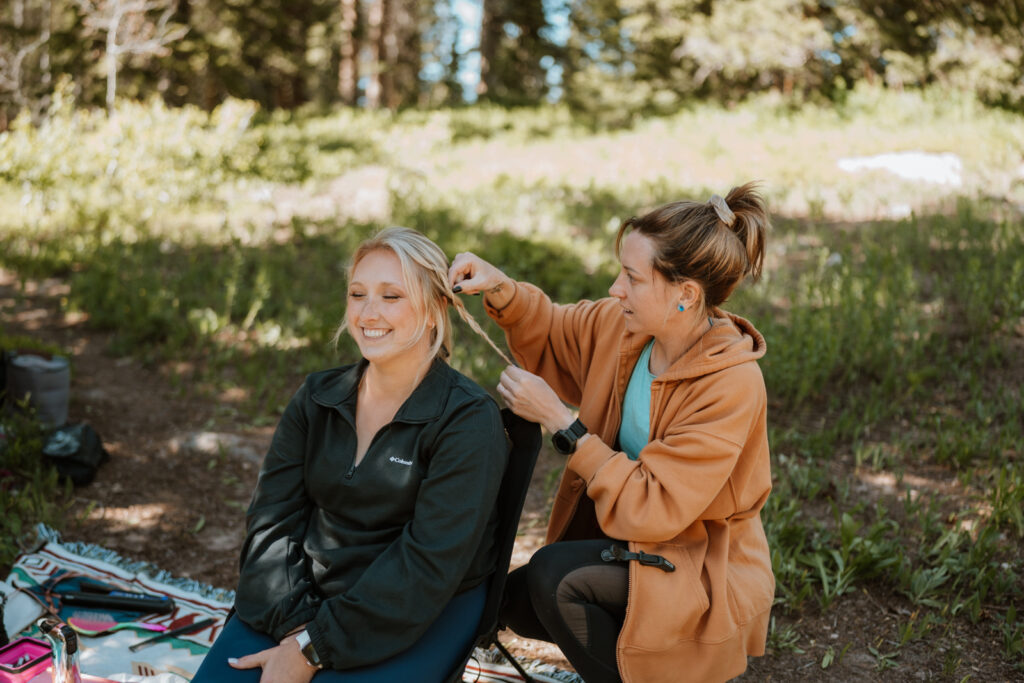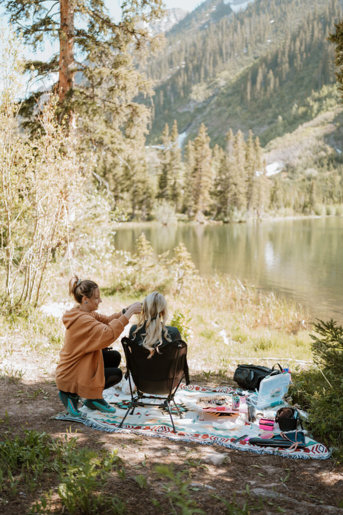 Hannah and Eli hired the amazing Ashley Easton from A Vow to Artistry. She is a total rockstar! She actually hiked up the trail with us to the first lake. While Eli was rigging up his fishing pole, Ashley was doing Hannah’s hair and makeup right there by the alpine lake! What a dream.