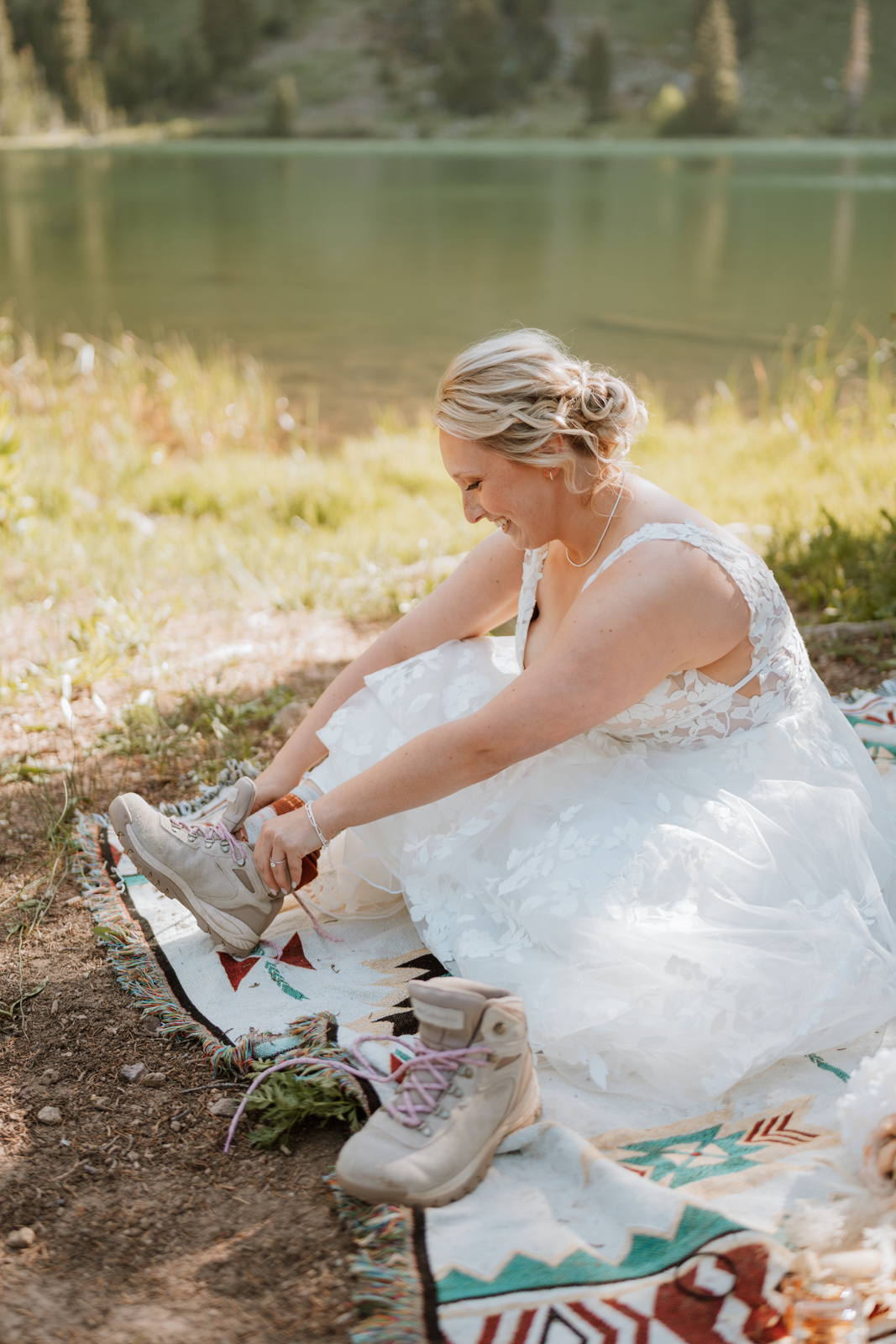 I hiked two blankets up the mountain so they each had a designated spot to get changed without getting dirt on their attire. We found Eli a quiet spot in the trees where he laid out his suit on the blanket and got dressed without a soul around. I did the same for Hannah right next to the lake, where Ashley helped zip up her dress and apply the finishing touches.