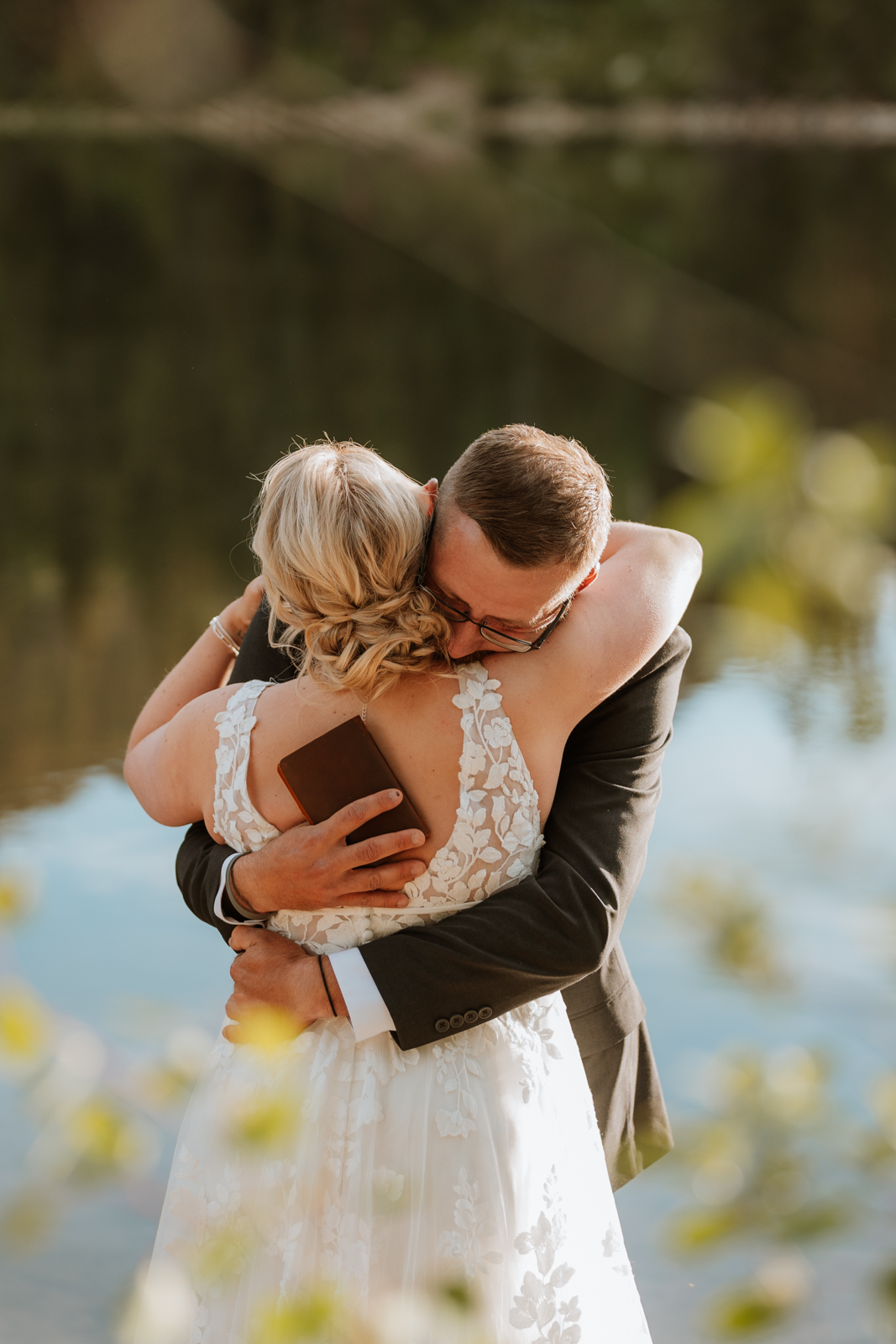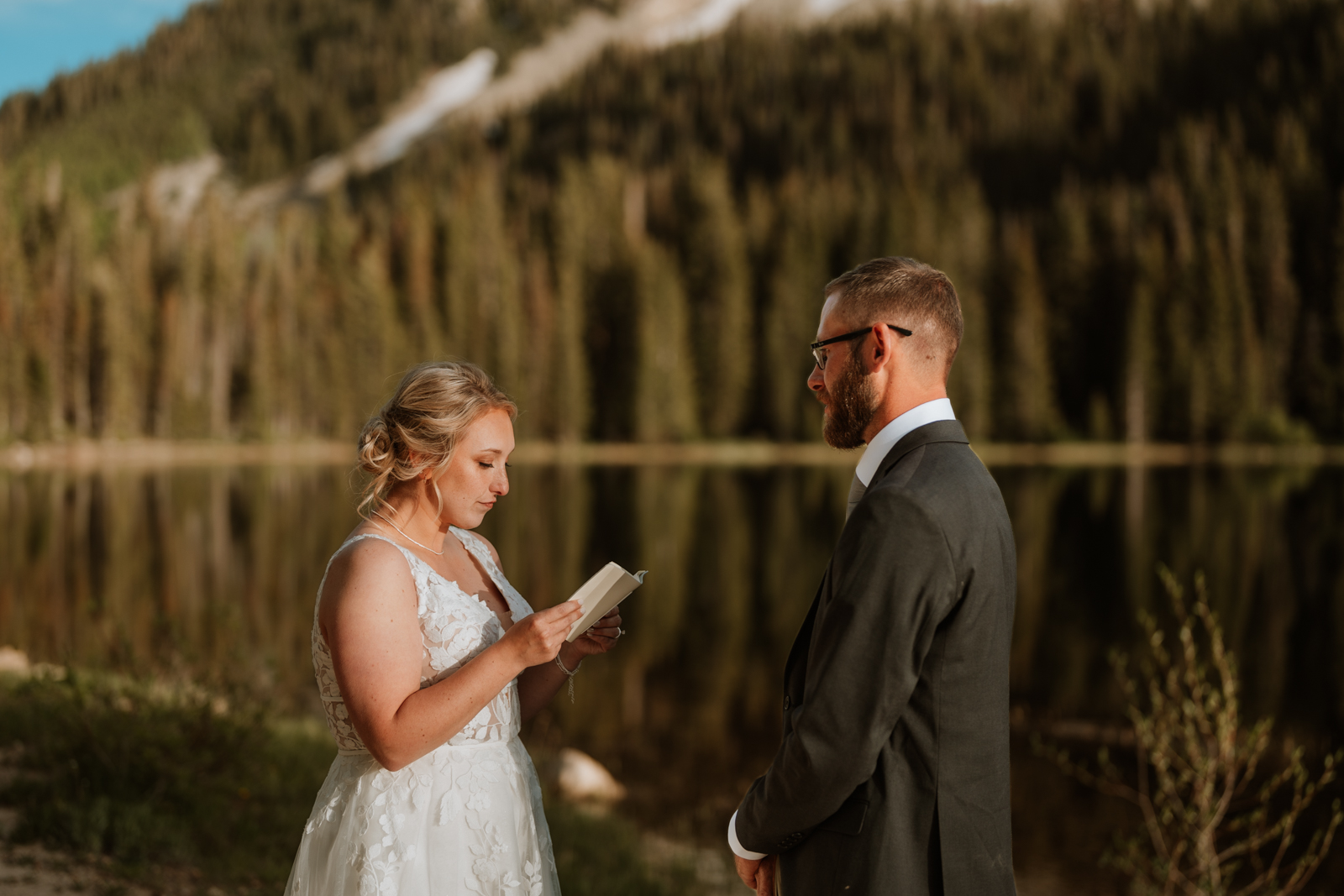 Once they were both ready, I got Eli set up next to the alpine lake for the first look. I had him close his eyes while I guided Hannah behind him. They stood back-to-back, then turned around at the exact same time to see each other! Seeing them explore the lakeshore together afterwards was magical.
