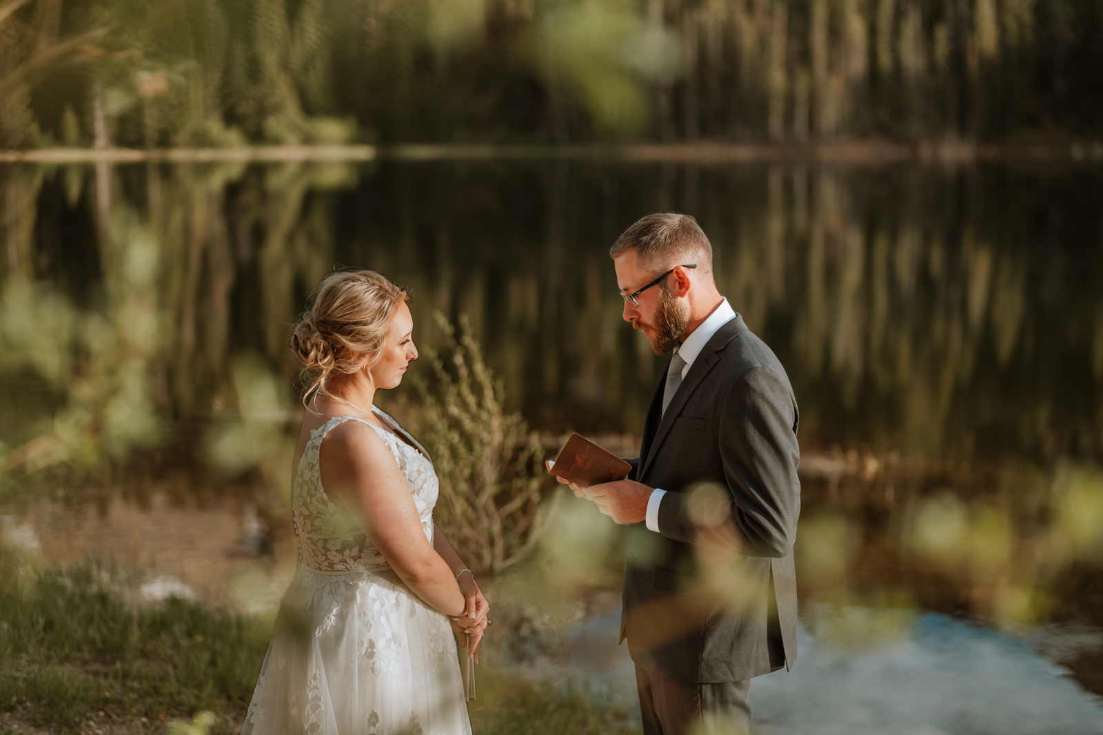 To get to their final ceremony spot, we actually had to cross a log jam floating in the lake! Talk about an adventurous wedding aisle. We found the perfect private spot on the sandy beach for them to read their handwritten vows.