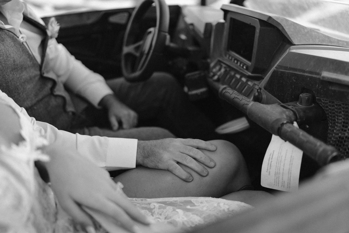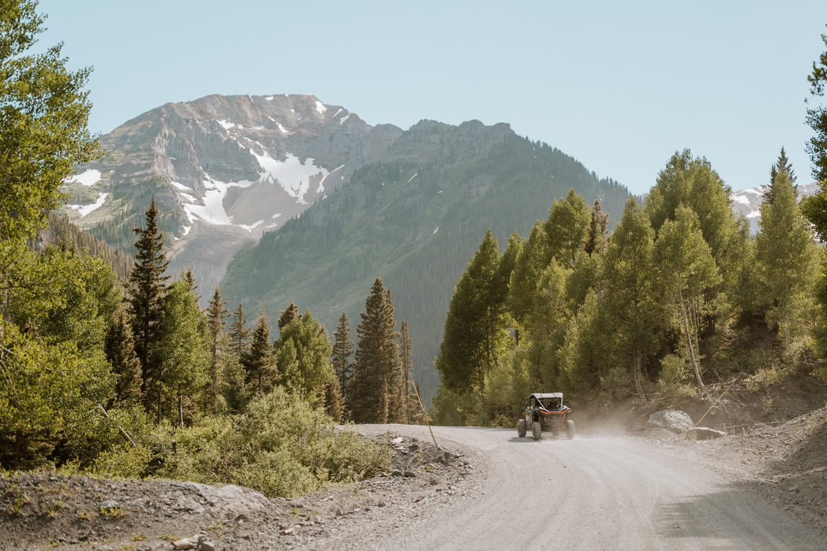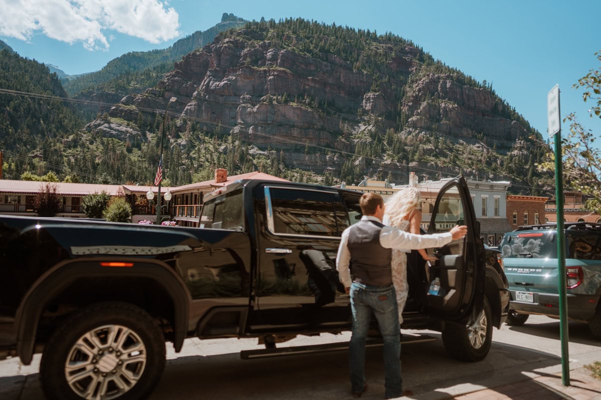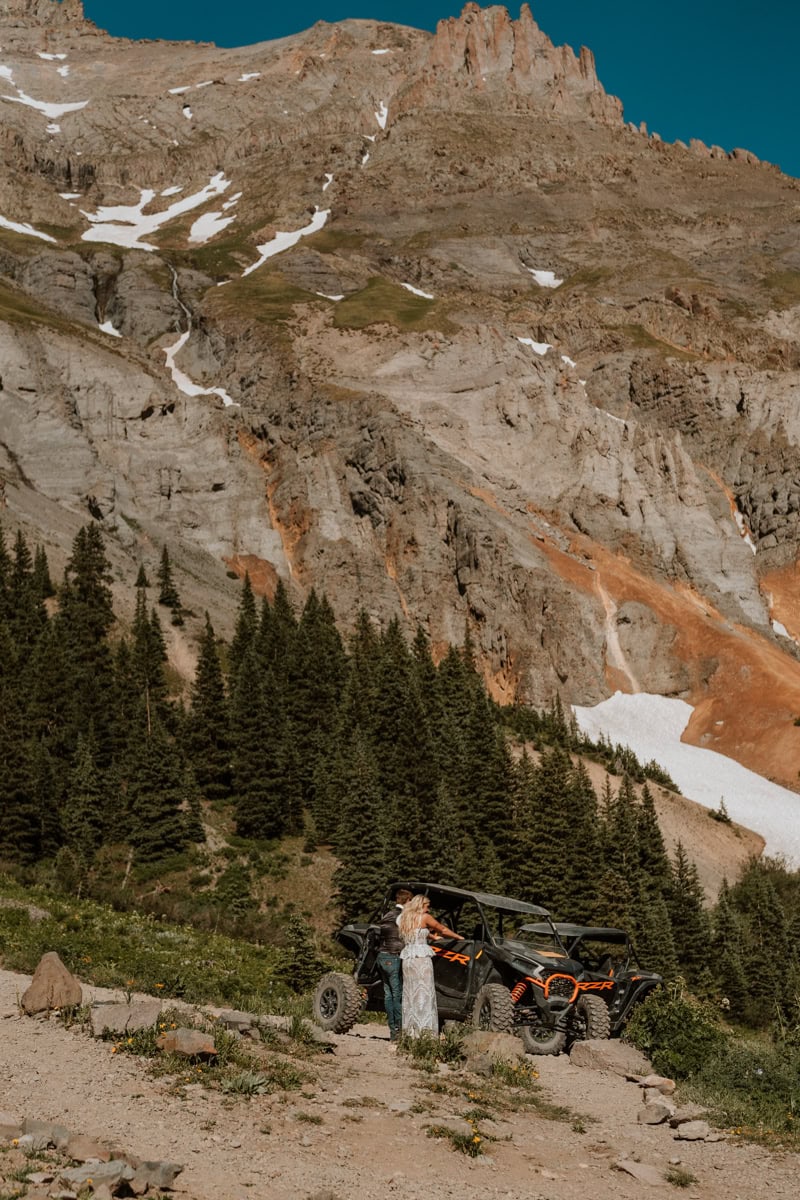 We headed up Camp Bird Road to pick up their rental side-by-sides. Since these two met in a UTV shop, watching them gear up felt like watching them in their natural habitat. There is something so cool about seeing a couple in full wedding attire, hopping into a rugged machine, ready to conquer a mountain.